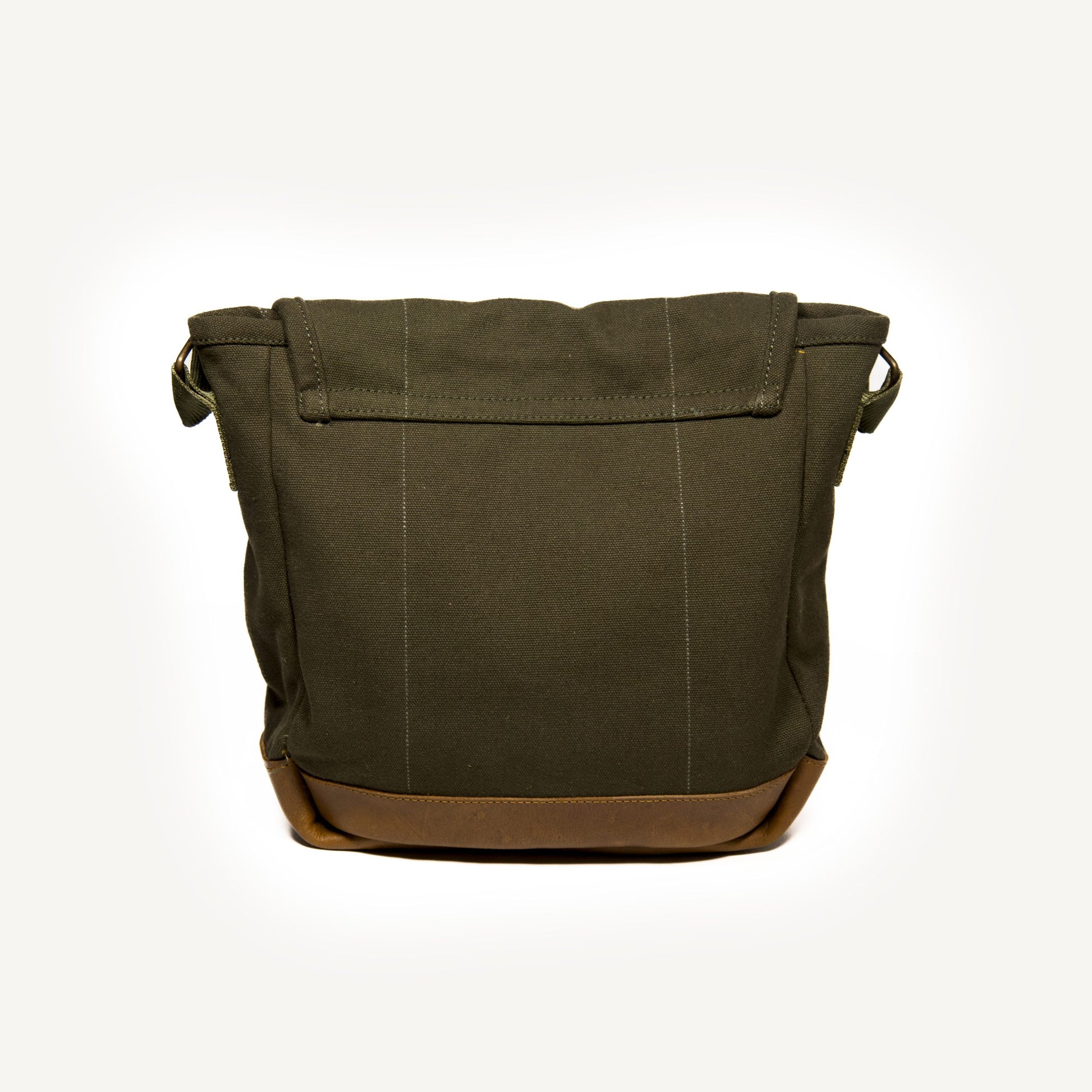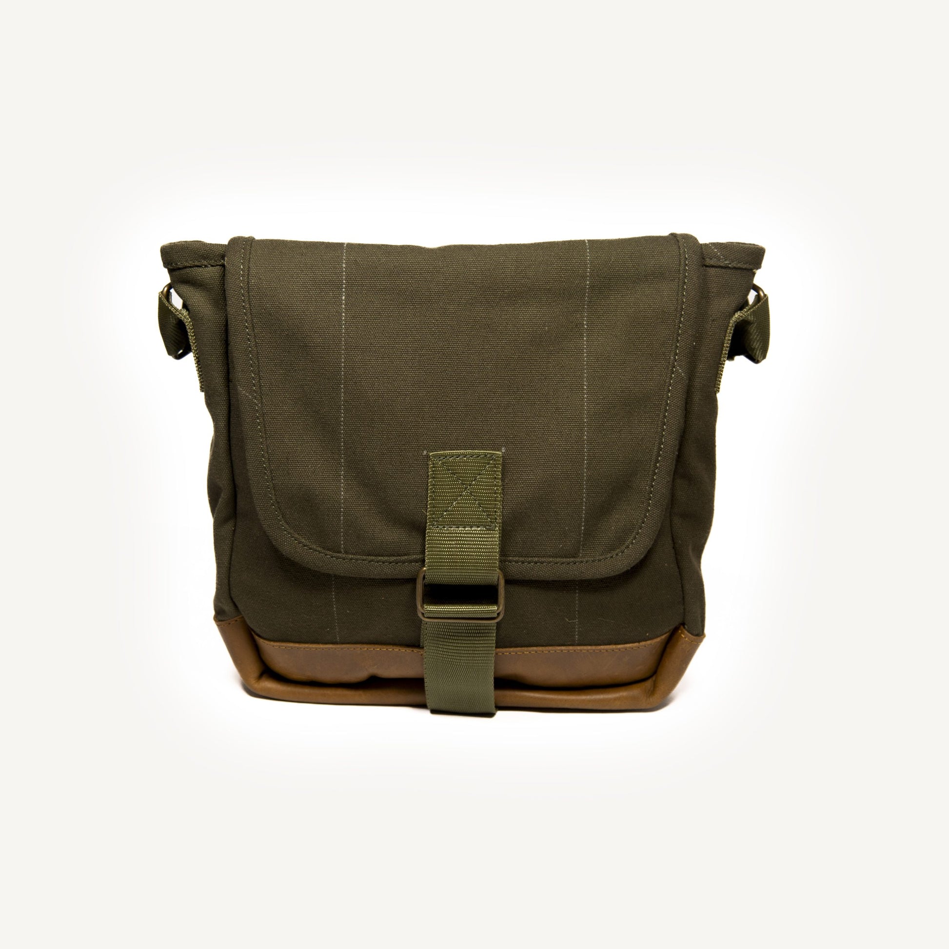 Color: Brown leather with army green canvas, lined with black print on natural cotton.