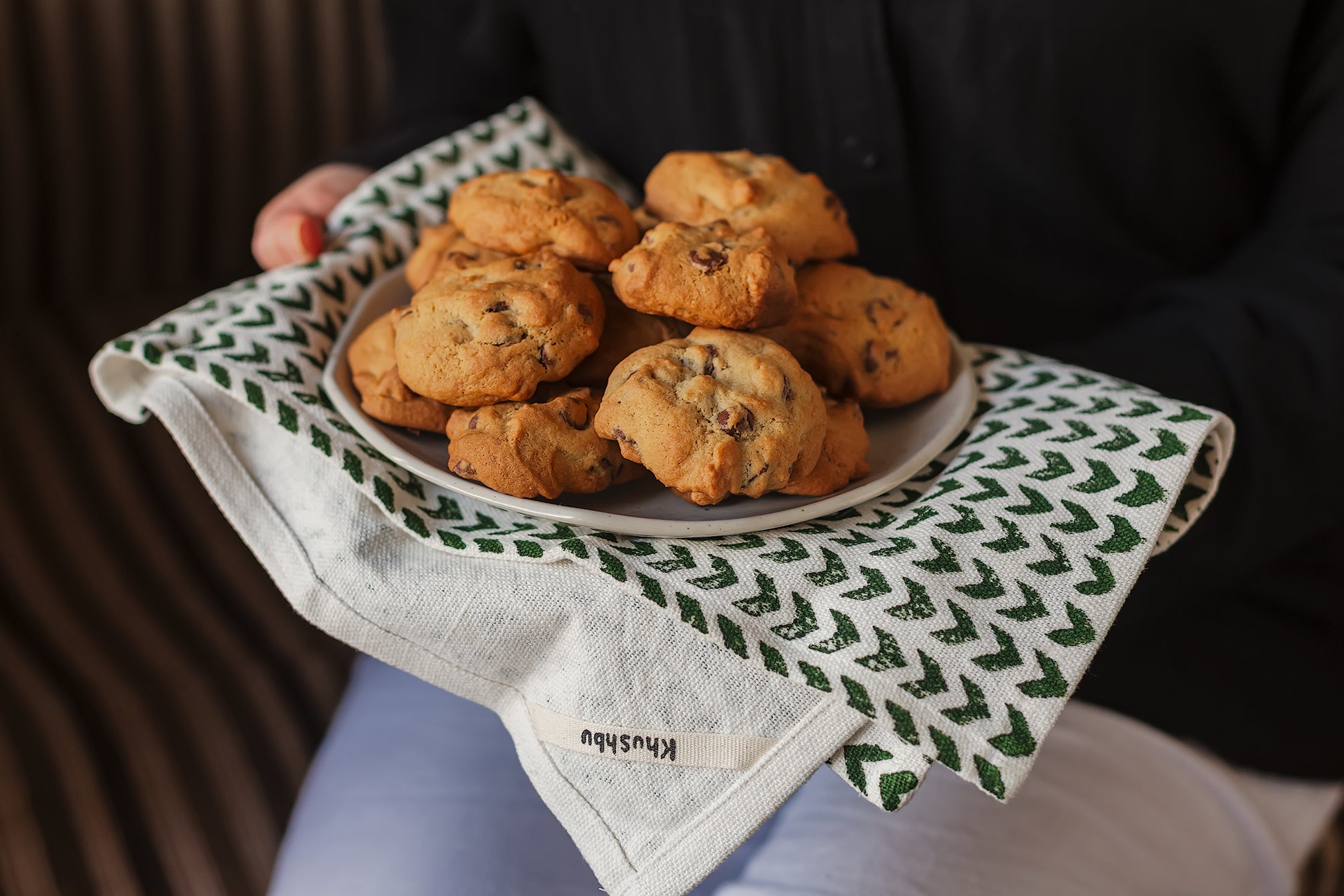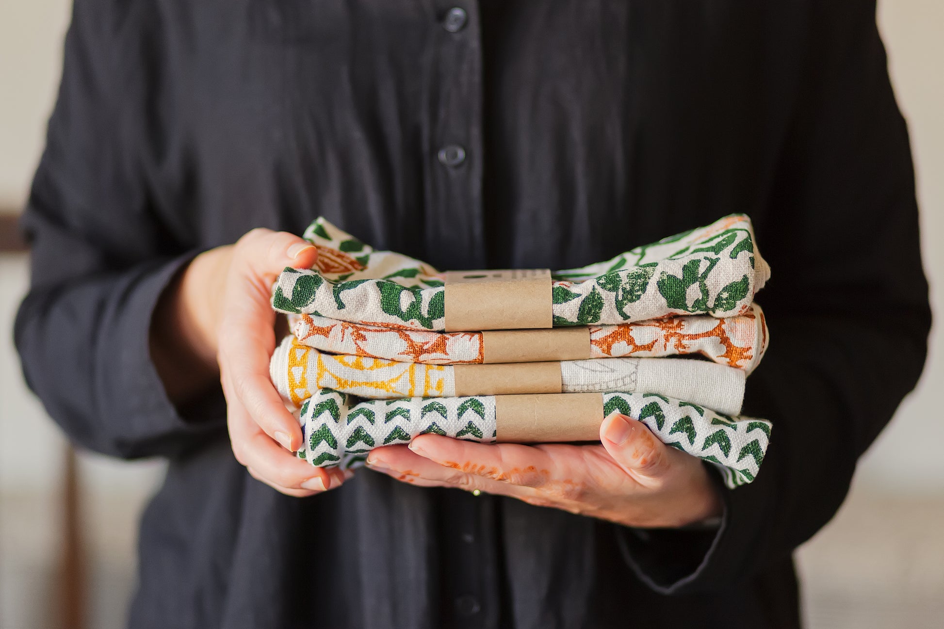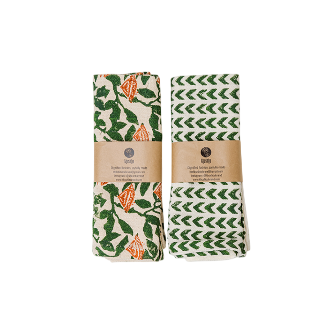 Hand block printed on soft linen fabric, Khushbu Tea Towels are the perfect accent for your kitchen or table. Leher is a geometric design of green waves.